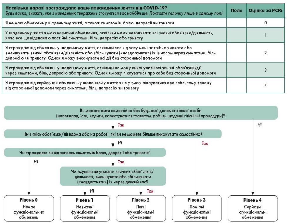 Зверніть увагу! Потреби пацієнта у реабілітації оцінюйте за допомогою самозвіту за шкалою Post-COVID-19 Functional Status (PCFS). При цьому опирайтесь на відповідну форму та блок-схему.